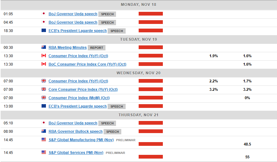 في المملكة المتحدة، أظهر الناتج المحلي الإجمالي للربع الثالث أن الاقتصاد البريطاني تباطأ إلى 0.1٪ مع انكماش الاقتصاد في سبتمبر بنسبة -0.1٪. وهذا يجعل بيانات مؤشر أسعار المستهلكين القادمة أكثر أهمية وإثارة للاهتمام مع التركيز على طباعة تضخم الخدمات مرة أخرى.