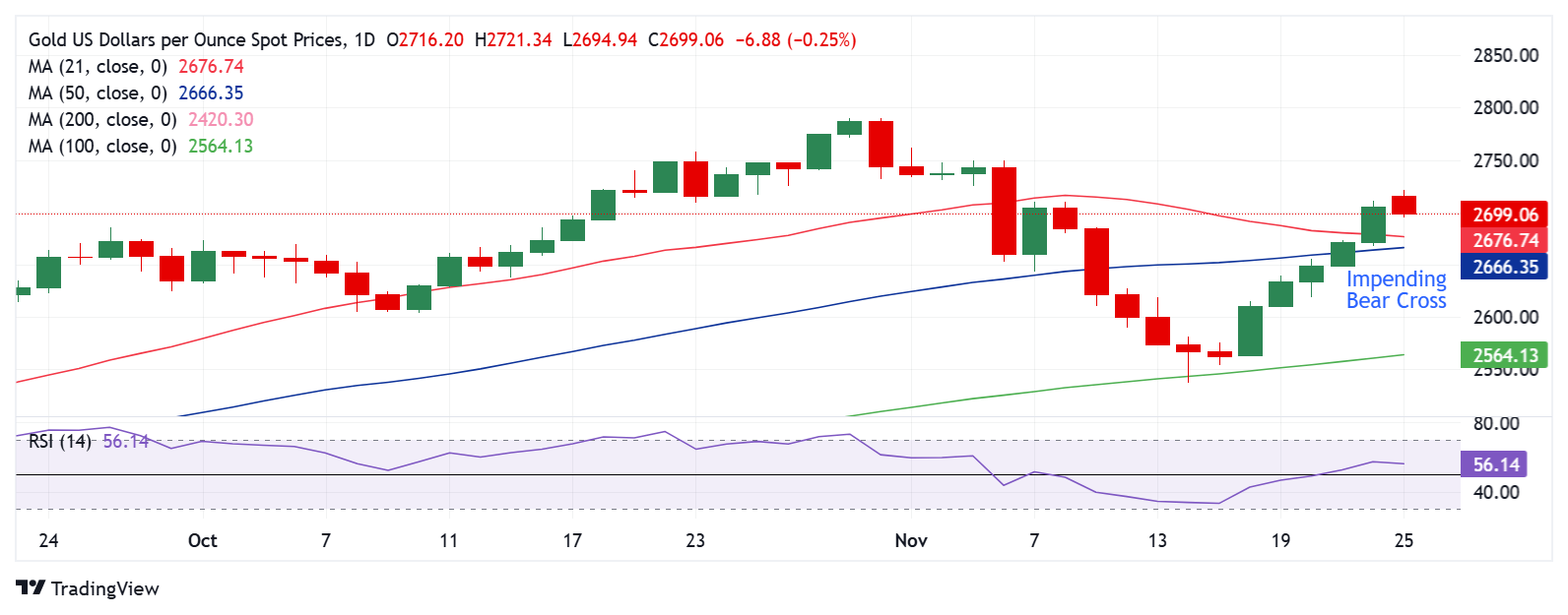 من ناحية أخرى، يحتاج مشتري الذهب إلى إغلاق شمعة يومية فوق أعلى مستويات 5 نوفمبر/تشرين الثاني عند منطقة 2750 دولار من أجل استئناف الاتجاه الصاعد نحو أعلى المستويات على الإطلاق عند منطقة 2790 دولار.