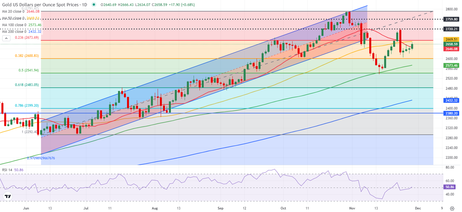ظلت الأسواق المالية في الولايات المتحدة مغلقة احتفالاً بعطلة عيد الشكر يوم الخميس، مما تسبب في تذبذب الذهب ضمن نطاق ضيق. استأنف العائد على السندات لأجل 10 سنوات انخفاضه الأسبوعي بعد عودة أسواق السندات إلى العمل في وقت مبكر من يوم الجمعة، مما سمح لزوج الذهب/الدولار الأمريكي XAU/USD بجمع الزخم الصعودي والارتفاع فوق 2650 دولار.