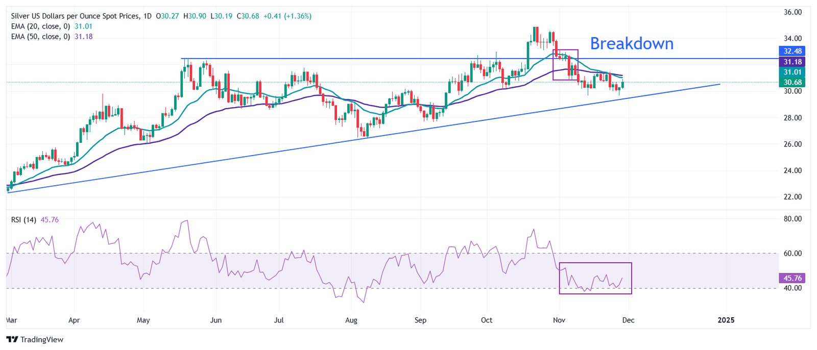 تعافى سعر الفضة بقوة بعد أن تراجع بالقرب من خط الاتجاه المائل صعوديًا قرب 29.50 دولار، والذي تم رسمه من أدنى مستوياته في 29 فبراير/شباط عند 22.30 دولار على الإطار الزمني اليومي. ومع ذلك، فإن توقعات سعر الفضة هبوطية حيث يشير التقاطع الهابط - الذي يمثله المتوسطين المتحركين الأسيين (EMA) لمدة 20 و50 يومًا قرابة المستوى 31.30 دولار - إلى تسارع في الاتجاه الهبوطي.