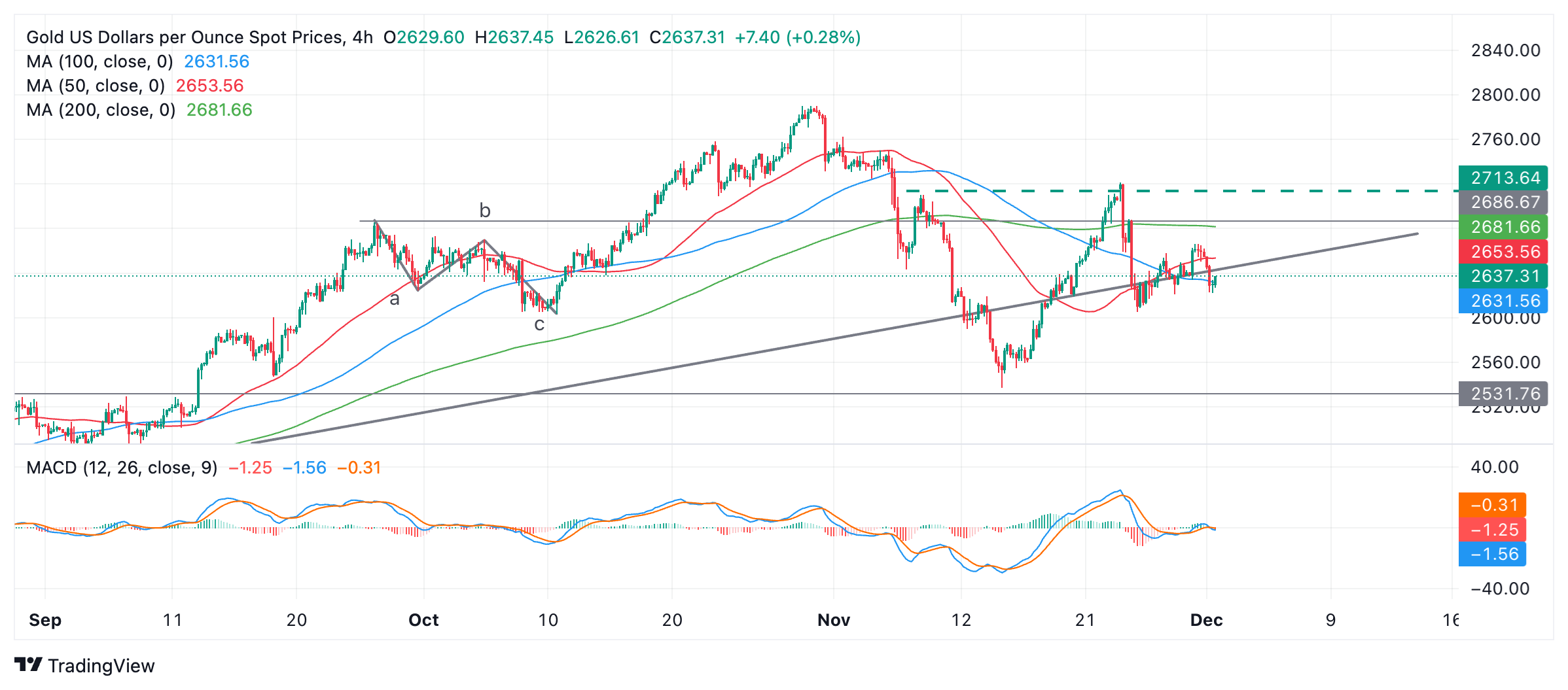 ضمن هذا السوق العرضي، يبدو أن الرسم البياني على وشك الانخفاض. يبدو الانخفاض من قمة 25 نوفمبر/تشرين الثاني غير مكتمل، وعلى الرغم من الدعم من خط الاتجاه، يبدو من المحتمل حدوث المزيد من التراجع. الاختراق دون 2605 دولار (قاع 26 نوفمبر) سيؤكد متابعة هبوطية نحو قيعان النطاق عند 2530 دولار.