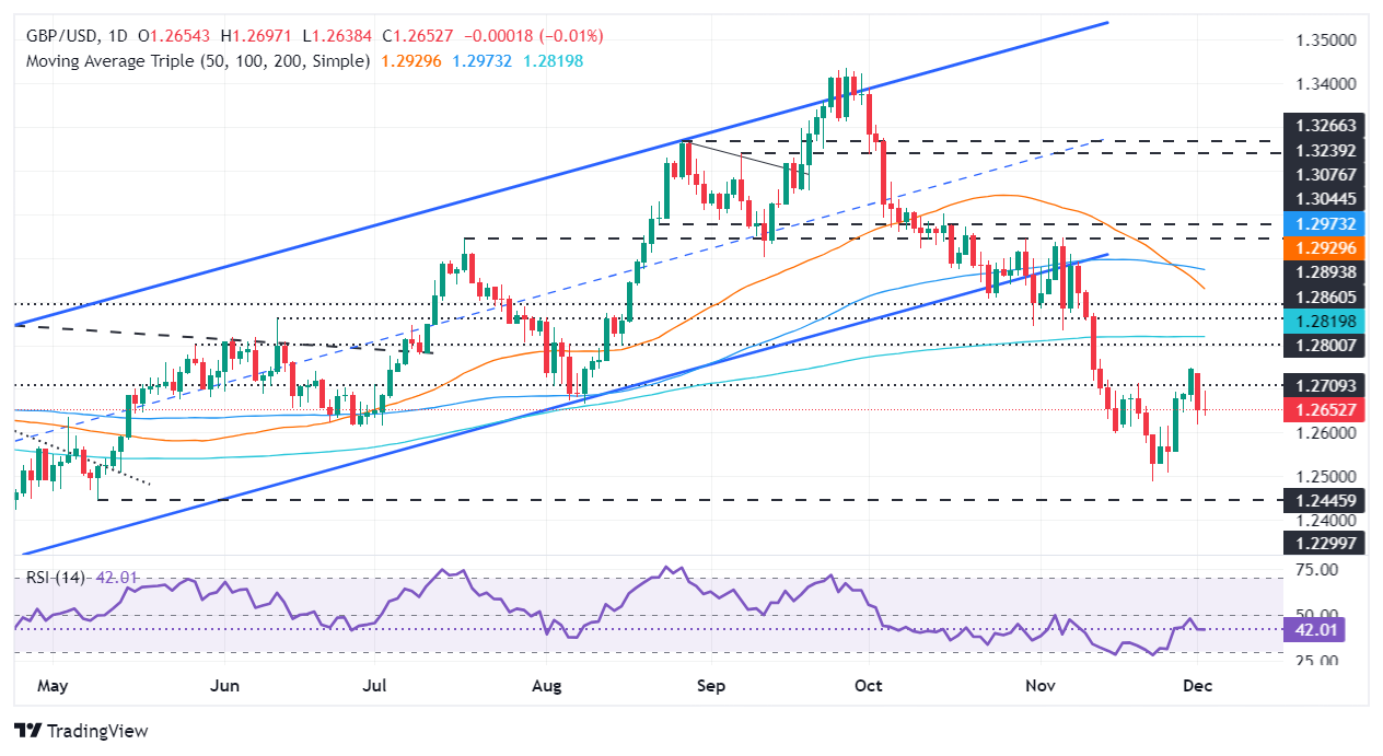 ينحاز زوج استرليني/دولار GBP/USD هبوطيًا على الرغم من تعافيه من أدنى مستوياته في ستة أشهر عند 1.2486 في 22 نوفمبر/تشرين الثاني. على الرغم من أن الزوج وصل إلى قمة أعلى في 29 نوفمبر عند 1.2749، إلا أنه فشل في البقاء فوق 1.2700.