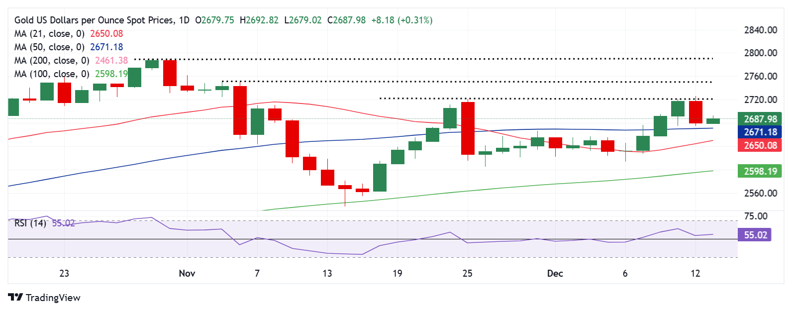 واجهت أسعار الذهب الرفض عند مستويات أعلى يوم الخميس وتحولت نحو الانخفاض قبل أن تجد دعماً عند المتوسط المتحرك البسيط 50 يومًا عند منطقة 2671 دولار في وقت مبكر من يوم الجمعة.