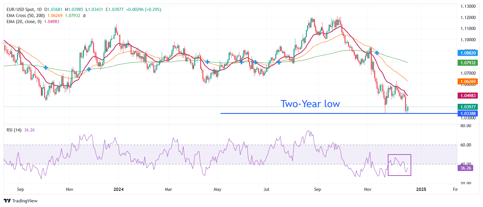 ارتد زوج يورو/دولار EUR/USD منتعشًا بشكل حاد فوق 1.0400 في جلسة التعاملات الأمريكية يوم الجمعة بعد أن سجل قاع جديد في ثلاثة أسابيع بالقرب من 1.0340 في ساعات التداول الآسيوية. انتعش زوج العملات الرئيسي حيث كان النمو في بيانات مؤشر أسعار نفقات الاستهلاك الشخصي في الولايات المتحدة (PCE ) أبطأ مما كان متوقعًا في نوفمبر/تشرين الثاني. أظهر تقرير التضخم أن  التضخم السنوي لنفقات الاستهلاك الشخصي الأساسي - وهو مقياس التضخم المفضل لدى بنك الاحتياطي الفيدرالي - ارتفع بشكل مطرد بنسبة 2.8٪، وهي وتيرة أبطأ من التقديرات البالغة 2.9٪. على أساس شهري، نما التضخم الأساسي بشكل معتدل بنسبة 0.1٪، مقابل التقديرات البالغة 0.2٪ والإصدار السابق البالغ 0.3٪.