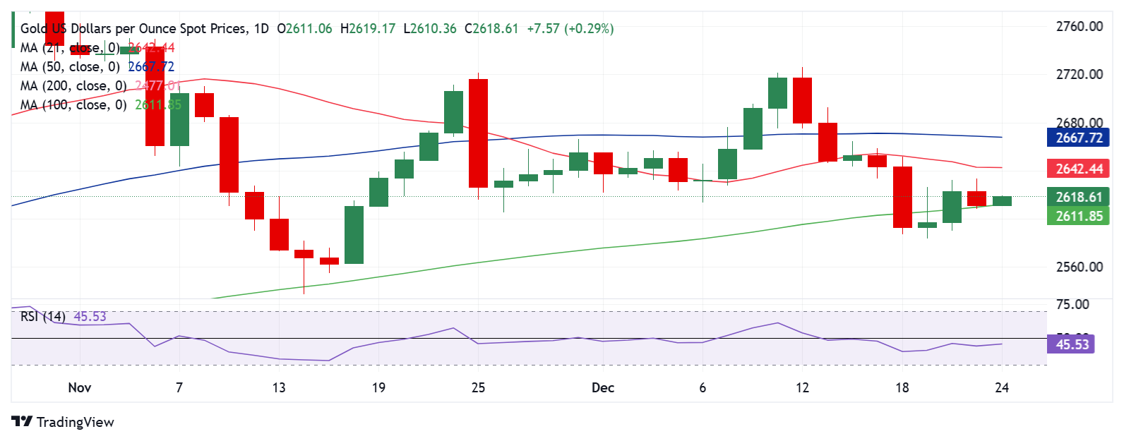 في الوقت الحالي، تدافع أسعار الذهب عن المتوسط المتحرك البسيط 100 يوم عند منطقة 2611 دولار بينما تستمر في مواجهة بائعين عند المتوسط المتحرك البسيط 21 يومًا عند منطقة 2642 دولار.