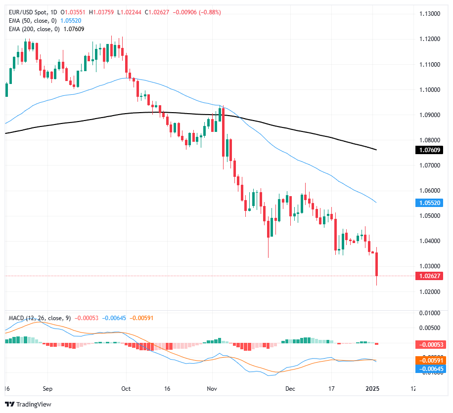 انخفض زوج يورو/دولار EUR/USD بمقدار نقطة مئوية كاملة أخرى يوم الخميس، ليبدأ عام 2025 بأدنى أسعار له في عامين. انخفض اليورو إلى ما دون 1.0250 مقابل الدولار الأمريكي منذ نوفمبر/تشرين الثاني 2022، مما وضع زوج يورو/دولار EUR/USD على المسار الصحيح لإغلاق للشهر الرابع على التوالي في المنطقة الحمراء إذا لم تتحسن الأمور في يناير/كانون الثاني.