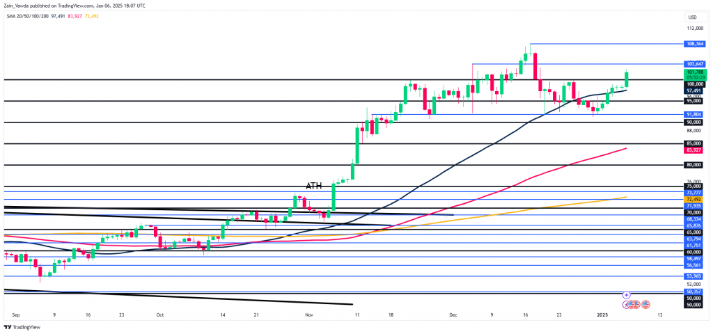 الرسم البياني اليومي للبيتكوين (BTC/USD)، 6 يناير 2025