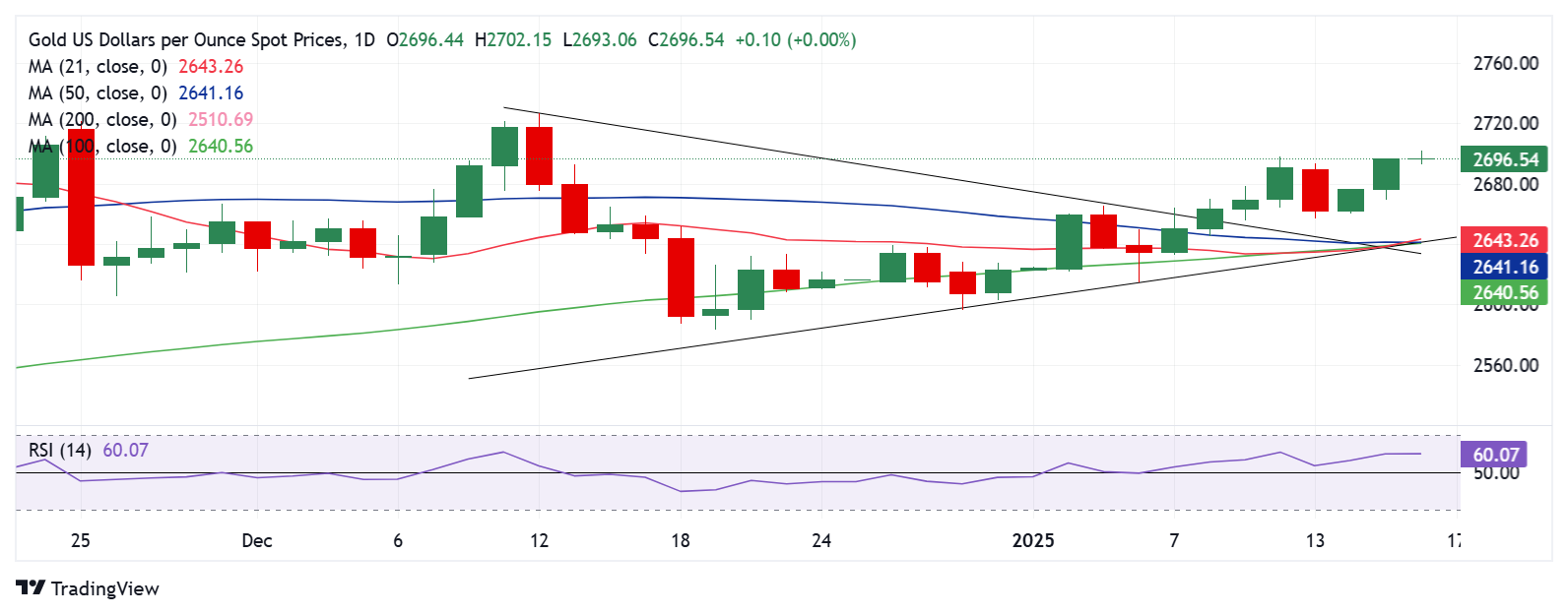 يجب أن تسعى أسعار الذهب إلى إغلاق شمعة يومية فوق حاجز منطقة 2700 دولار من أجل بدء اتجاه صاعد جديد نحو الحاجز النفسي عند منطقة 2750 دولار.