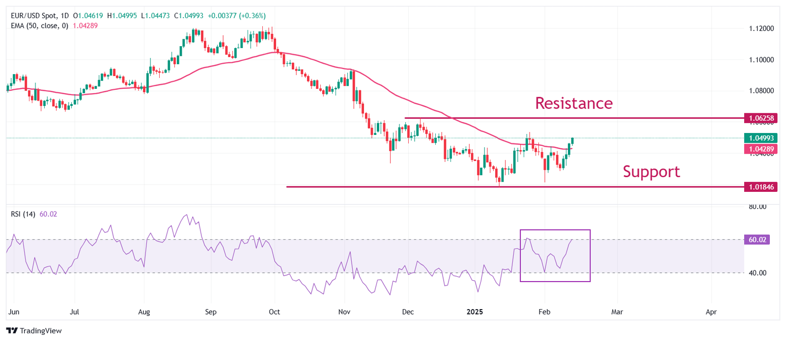 يمدد زوج يورو/دولار EUR/USD انتعاشه إلى قرب 1.0500 خلال ساعات التداول في أمريكا الشمالية يوم الجمعة. يرتفع الزوج الرئيسي بعد تجاوزه المتوسط المتحرك الأسي (EMA) لمدة 50 يومًا، والذي يتداول حول 1.04282.