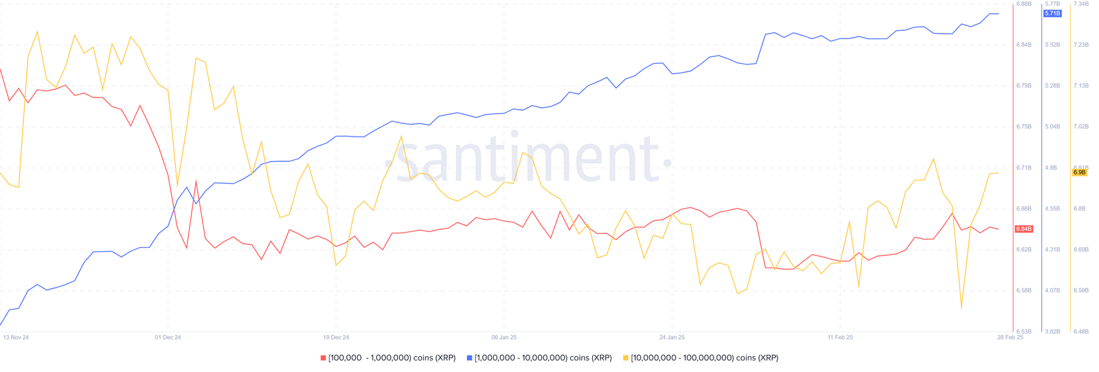 ومع ذلك، كانت محافظ عملة ريبل XRP الضخمة تشتري الانخفاضات بكثافة منذ انهيار السوق يوم الاثنين. خلال هذه الفترة، قامت المحافظ الضخمة التي تمتلك ما بين مليون إلى 10 مليون من عملة ريبل XRP و10 مليون إلى 100 مليون من عملة ريبل XRP بزيادة إجمالي حيازاتها بمقدار 440 مليون من عملة ريبل XRP، بقيمة تقترب من مليار دولار.