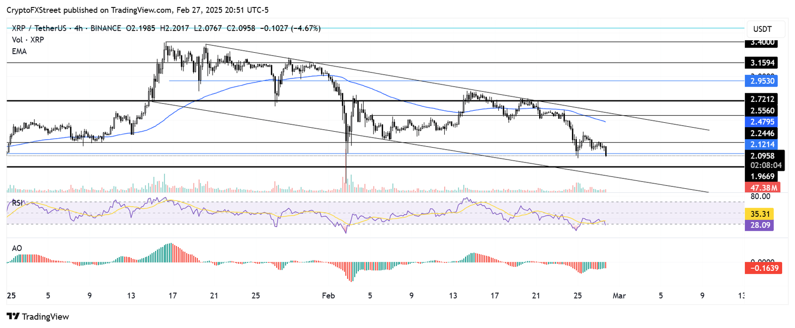 إذا استمرت الضغوط الهبوطية وفشلت عملة ريبل XRP في الحفاظ على منطقة 1.96 دولار الحاسمة، فقد تجد دعماً بالقرب من الحد السفلي للقناة السعرية الهابطة.