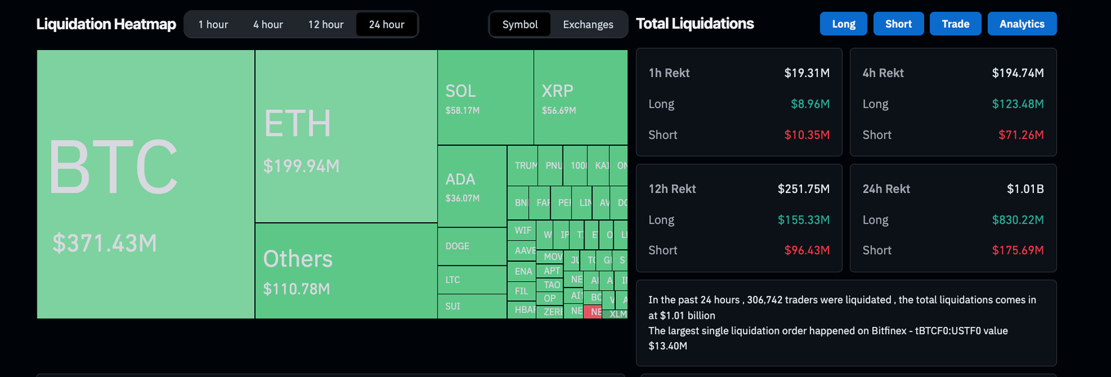 في الساعات الأربع والعشرين الماضية، تم تصفية أكثر من 390 مليون دولار من مراكز البيتكوين الطويلة، مما يمثل حوالي 40% من إجمالي تصفية السوق البالغ 1 مليار دولار.