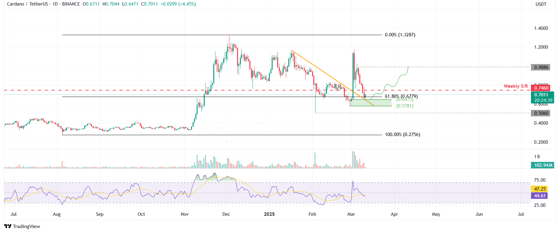 تتعافى كاردانو (ADA) قليلاً بنسبة 4%، وتتداول حول 0.70 دولار يوم الثلاثاء بعد أن انخفضت بنحو 7% في اليوم السابق. تشير المقاييس على السلسلة إلى مزيد من التعافي حيث يتحول معدل تمويل ADA إلى إيجابي بينما تصل رهاناتها الصعودية إلى أعلى مستوى لها خلال شهر.