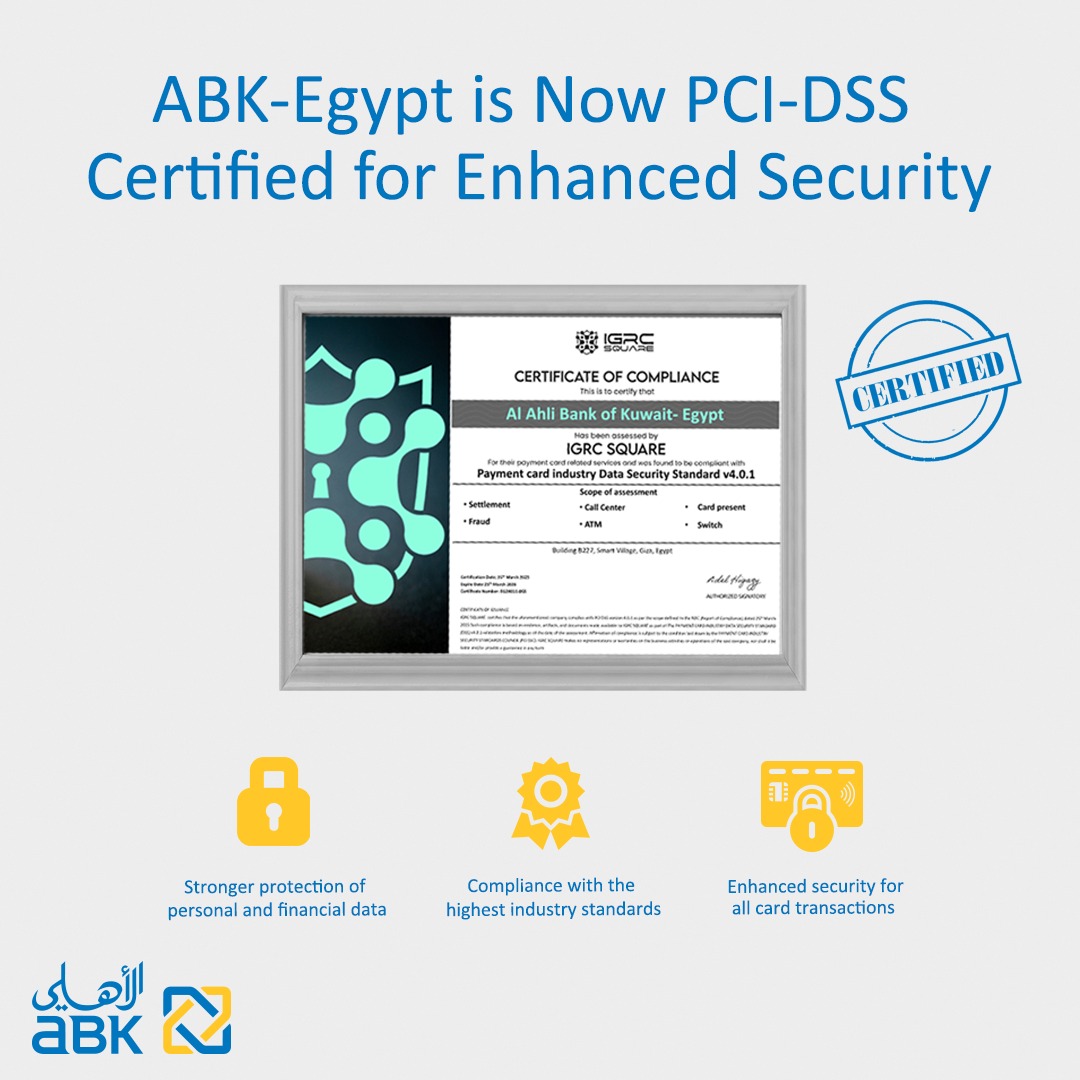 حصل البنك الأهلي الكويتي – مصر على شهادة PCI DSS الإصدار 4.0.1 (معيار أمان بيانات صناعة بطاقات الدفع الإلكتروني)، وهي شهادة دولية معتمدة تمنح للكيانات التي تلتزم بأعلى معايير حماية البيانات.