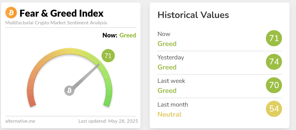 مؤشر الخوف والطمع من alternative.me، وهو مقياس يقيس الشعور العام في سوق العملات المشفرة، سجل 71 يوم الأربعاء، مما يشير إلى “طمع” مرتفع بين المستثمرين. ومع ذلك، فإنه يتناقص من 74 في اليوم السابق.