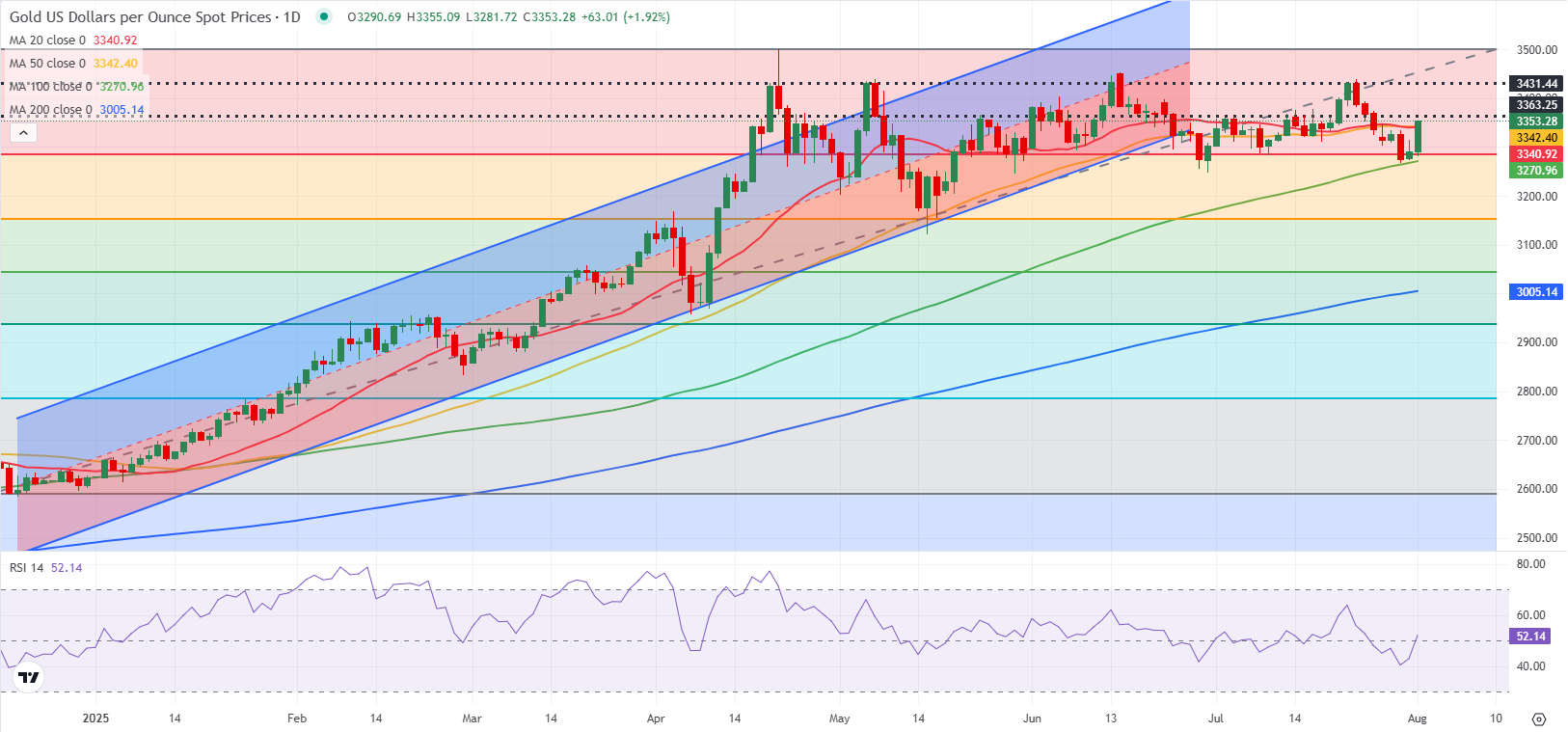 استعاد مؤشر القوة النسبية (RSI) على الرسم البياني اليومي فوق 50 بعد بيانات الوظائف غير الزراعية الصادرة اليوم الجمعة وارتفع الذهب فوق 3340 دولار، حيث يتقارب المتوسطان المتحركان البسيطان لمدة 20 يومًا و50 يومًا، مما يبرز تردد البائعين.