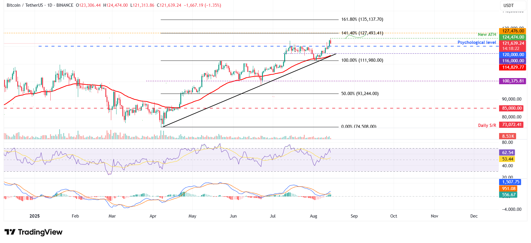 - يتداول سعر البيتكوين فيما دون 121,800 دولار يوم الخميس بعد أن وصل إلى قمة تاريخية بلغت 124,474 دولار في جلسة التداولات الآسيوية المبكرة.