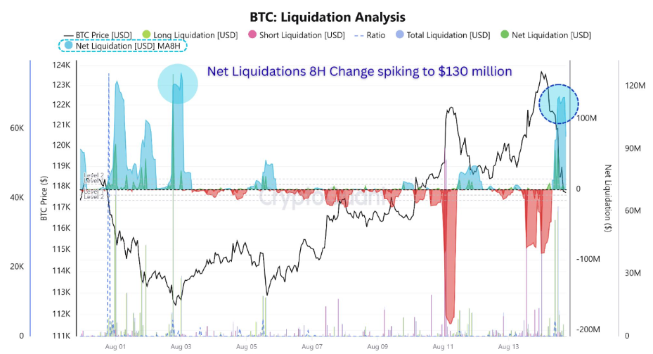 تكشف دراسة بيانات التصفية أن الجولة الأخيرة من إغلاق المراكز القسرية أثرت بشكل أساسي على مراكز الشراء المتأخرة، مما يشير إلى أن المتداولين كانوا متفائلين بشكل مفرط. يظهر الرسم البياني لعمليات التصفية الصافية على مدى 8 ساعات أدناه ارتفاعًا إلى 130 مليون دولار. تشير هذه النمط إلى ضغط شراء طويل — وهو سيناريو حيث تؤدي الأسعار المتراجعة إلى تحفيز أوامر بيع متتالية من المشترين ذوي الرافعة المالية العالية.