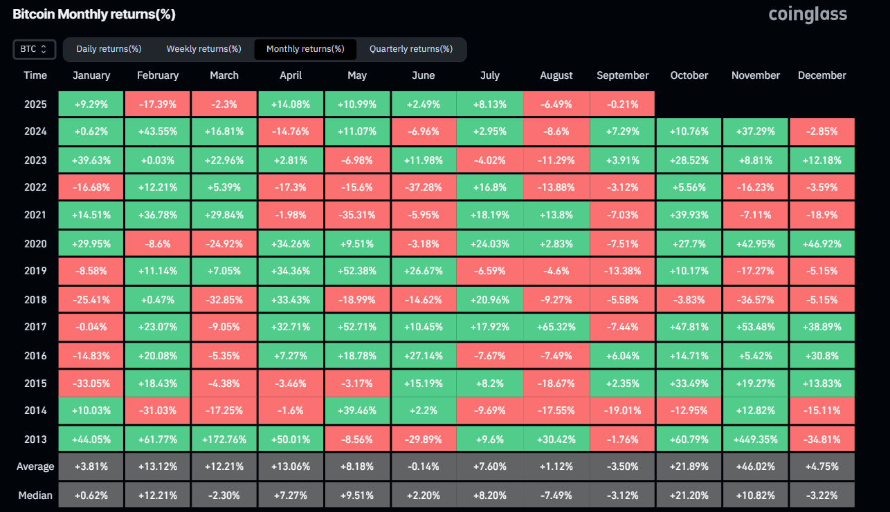 بعد انخفاض بنسبة 6.49% في عوائد البيتكوين في أغسطس/آب، تشير بيانات CoinGlass التاريخية إلى أن البيتكوين عمومًا يحقق عائدًا سلبيًا للمتداولين في سبتمبر/أيلول، مع متوسط خسارة قدره 3.50%.