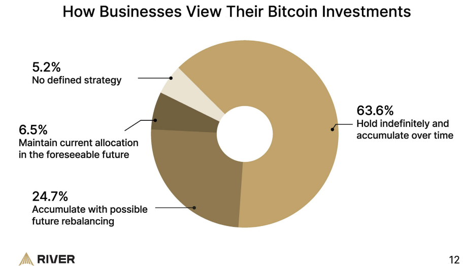 أوضح التقرير أيضًا أن 63.6% من هذه الشركات تعتبر البيتكوين استثمارًا طويل الأجل، حيث تتراكم بشكل مستمر دون خطط للبيع أو إعادة التوازن في المستقبل القريب.