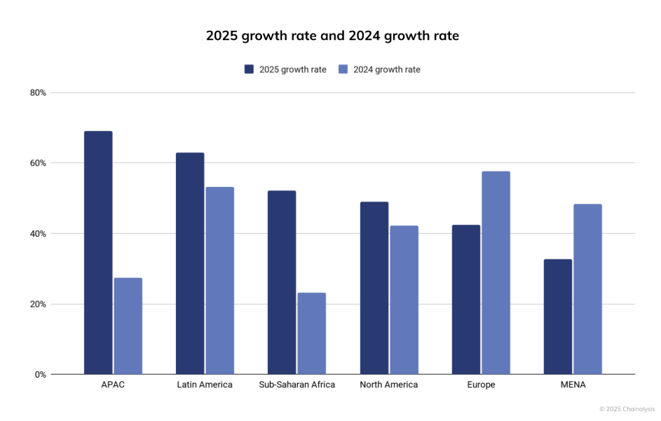 تشير التقرير إلى أن منطقة آسيا والمحيط الهادئ (APAC) قادت النمو بنسبة 69% على أساس سنوي في معاملات العملات المشفرة على السلسلة، مدفوعة بشكل أساسي من قبل الهند وفيتنام وباكستان، بينما جاءت أمريكا اللاتينية في المرتبة الثانية بنمو قدره 63%.