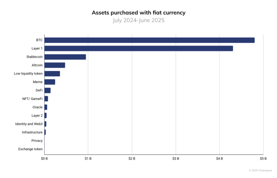 علاوة على ذلك، تظل البيتكوين هي نقطة الدخول الرئيسية (تعمل كبوابة رئيسية إلى اقتصاد العملات المشفرة)، حيث سجلت تدفقات نقدية تزيد عن 4.6 تريليون دولار بين يوليو/تموز 2024 ويونيو/حزيران 2025، وهو ما يعادل ضعف تدفقات الرموز من الطبقة الأولى (باستثناء البيتكوين والإيثريوم).