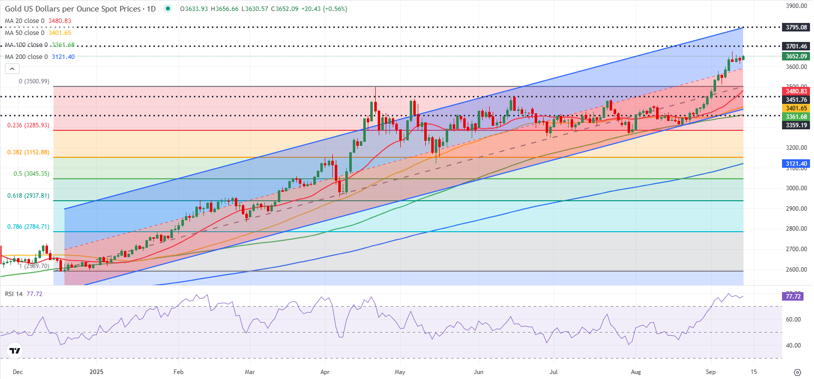 بدأ الذهب الأسبوع بنبرة صعودية حيث استمر التأثير السلبي لبيانات سوق العمل المخيبة للآمال لشهر أغسطس/آب التي صدرت يوم الجمعة الماضية على الدولار الأمريكي (USD). بعد ارتفاعه بأكثر من 1% يوم الاثنين، حافظ الذهب على زخمه الصعودي وسجل قمة تاريخية جديدة فوق 3670 دولارًا يوم الثلاثاء، مدعومًا بضعف الدولار المستمر وتصاعد التوترات الجيوسياسية.