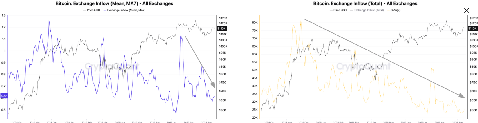 بالنسبة للحالة الصعودية، يبقى ضغط بيع البيتكوين عند مستويات منخفضة، حيث تنخفض الودائع الكبيرة في البورصات. يظهر الرسم البياني أدناه أن إجمالي البيتكوين المتدفق إلى البورصات قد انخفض إلى متوسط متحرك لمدة 7 أيام بقيمة 25,000 بيتكوين، وهو أحد أدنى المستويات في أكثر من عام، وانخفاض كبير من 51,000 بيتكوين في 17 يوليو/تموز، عندما كان سعر البيتكوين يتداول قرابة 120,000 دولار لأول مرة على الإطلاق.