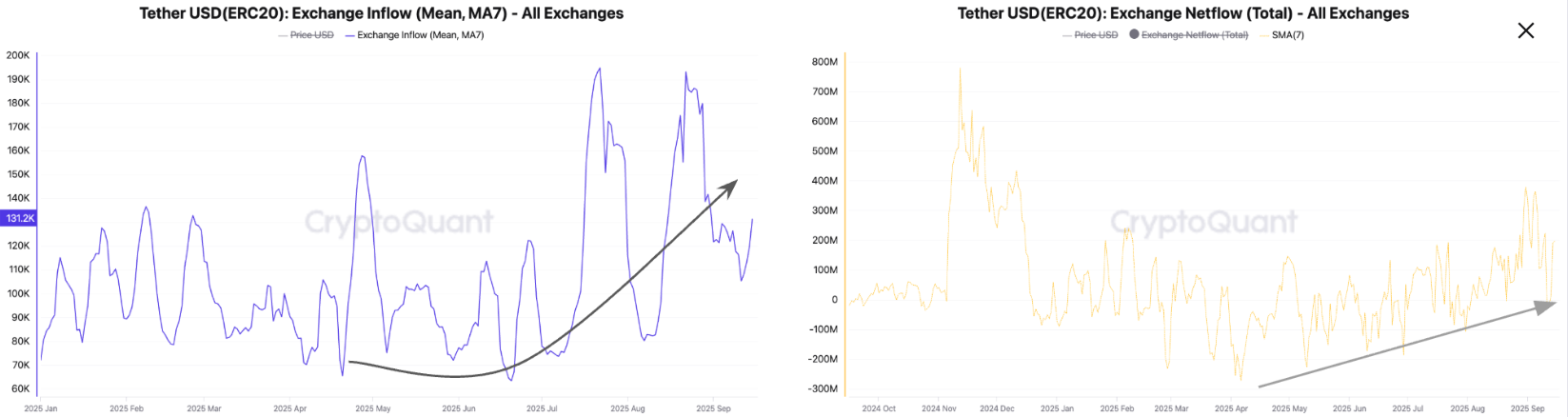 بعيدًا عن ذلك، يتوسع رأس المال السائل اللازم لارتفاع العملات المشفرة، مع زيادة إجمالي الودائع من عملات التيثر (USDT) في البورصات حيث يقوم المستثمرون الكبار بتحديد مواقعهم قبل قرار الاحتياطي الفيدرالي. ارتفعت ودائع التيثر الصافية من 273 مليون دولار في 6 أبريل/نيسان إلى 379 مليون دولار في 31 أغسطس/آب، وهو أعلى مستوى هذا العام. يتم دفع الكمية الأكبر من التيثر المتدفقة إلى البورصات من خلال الودائع الكبيرة، حيث ارتفع متوسط الإيداع اليومي إلى 130,000 دولار يوم الثلاثاء من أدنى مستوى له في 2025 البالغ 63,000 دولار في يوليو/تموز.