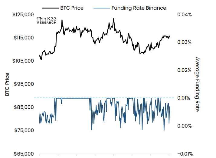 علاوة على ذلك، لا يزال السوق غير متأكد، وفقًا لتقرير K33 الذي صدر هذا الأسبوع. تحافظ معدلات التمويل على نمط متقلب، حيث تحوم دون المستويات المحايدة بينما لا يزال المتداولون مترددين في الإضافة إلى مراكزهم الطويلة.