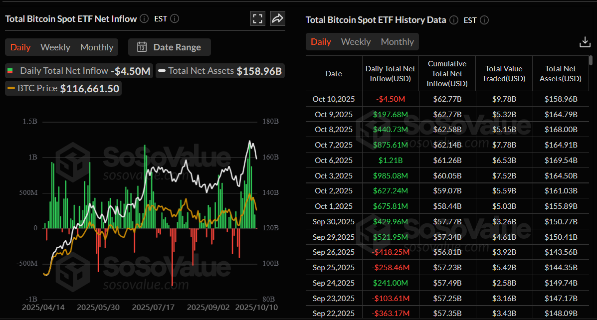تعرض سعر البيتكوين للرفض بعد الوصول إلى قمة تاريخية جديدة عند 126,199 دولار في 6 أكتوبر/تشرين الأول. ثم انخفض، ليصل لفترة وجيزة إلى أدنى مستوى يومي عند 102,000 دولار يوم الجمعة، وتراجع بأكثر من 11% من أعلى مستويات يوم الثلاثاء إلى أدنى مستويات يوم السبت. ومع ذلك، تعافى سعر البيتكوين قليلاً يوم الأحد، ليغلق فوق 114,900. في وقت كتابة هذا التقرير يوم الاثنين، يحوم السعر قرابة 115,000 دولار.