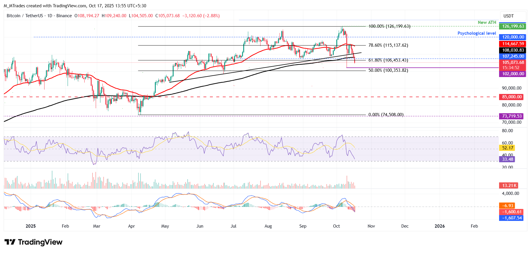 تعرض سعر البيتكوين للرفض من المتوسط المتحرك الأسي لمدة 50 يومًا عند 114,667 دولار يوم الثلاثاء وانخفض بنحو 6% حتى يوم الخميس، ليغلق دون خط الاتجاه الصاعد. في وقت كتابة هذا التقرير يوم الجمعة، تستمر البيتكوين في التداول دون 105,000 دولار.