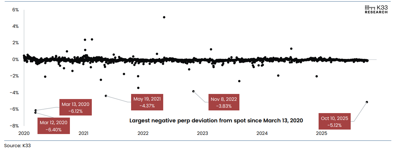بعد تدفق السيولة الضخم وحدث تقليص المديونية المالية الأسبوع الماضي يوم الجمعة، عندما انخفض سعر البيتكوين من القمة اليومية عند 122,550 دولار إلى قاع عند 102,000 دولار، يشير تقرير K33 الذي صدر هذا الأسبوع إلى أن الأسابيع القادمة قد تقدم نافذة مواتية لنشر رأس المال في البيتكوين، حيث قد تمهد إعادة ضبط الأسواق الدائمة وعودة ديناميكيات التمويل الطريق لزخم صعودي متجدد.