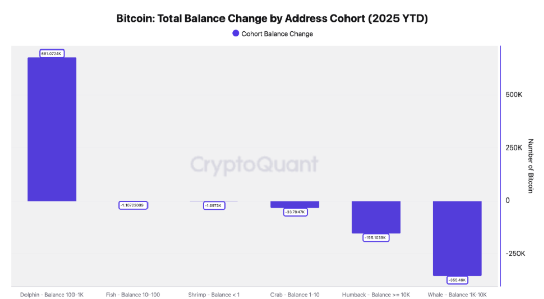 يشرح التقرير أن مجموعة الدولفين - التي تتكون من صناديق الاستثمار المتداولة، والشركات، وحاملي الكميات الكبيرة - لا تزال هي الأساس في هيكل الطلب في هذه الدورة. حتى الآن هذا العام، كانت مجموعة الدولفين هي المجمع الرئيسي، حيث زاد رصيدها الإجمالي بأكثر من 681,000 بيتكوين، بينما شهدت جميع مجموعات العناوين الأخرى انخفاضات صافية في الحيازات. تُظهر هذه الفجوة أن المستثمرين الكبار والكيانات المؤسسية قد امتصوا العرض من المشاركين الأصغر في السوق، مما يوفر قاعدة طلب قوية خلال الدورة الأخيرة.