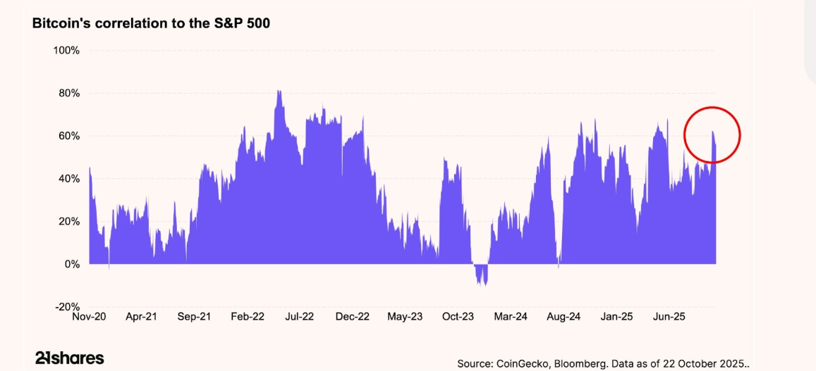 أشار التقرير الأسبوعي لشركة 21Shares إلى أن انهيار السوق في 10 أكتوبر/تشرين الأول نجم عن اقتراح الرئيس ترامب بفرض تعريفات جمركية بنسبة 100% على الواردات الصينية، مما أعاد إشعال مخاوف الحرب التجارية ودفع ارتباط البيتكوين مع مؤشر إس آند بي 500 فوق 60%.