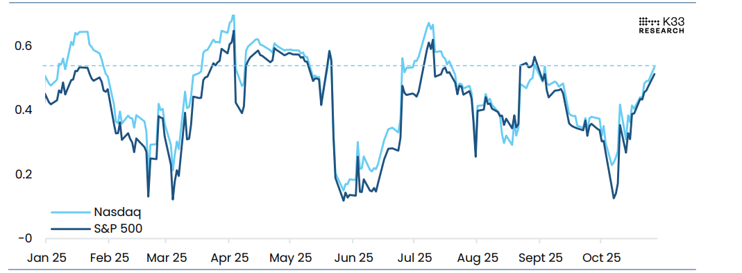 يوضح الرسم البياني أدناه أن العلاقة بين البيتكوين والأسهم الأمريكية قد ارتفعت مؤخرًا. لقد ارتفعت العلاقة لمدة 30 يومًا بين البيتكوين ومؤشر ناسداك إلى 0.53، وهو أعلى مستوى منذ أواخر أغسطس/آب. مع ارتفاع العلاقات، من المتوقع أن تؤثر الأرباح واجتماع اللجنة الفيدرالية بشكل كبير على اتجاه البيتكوين.