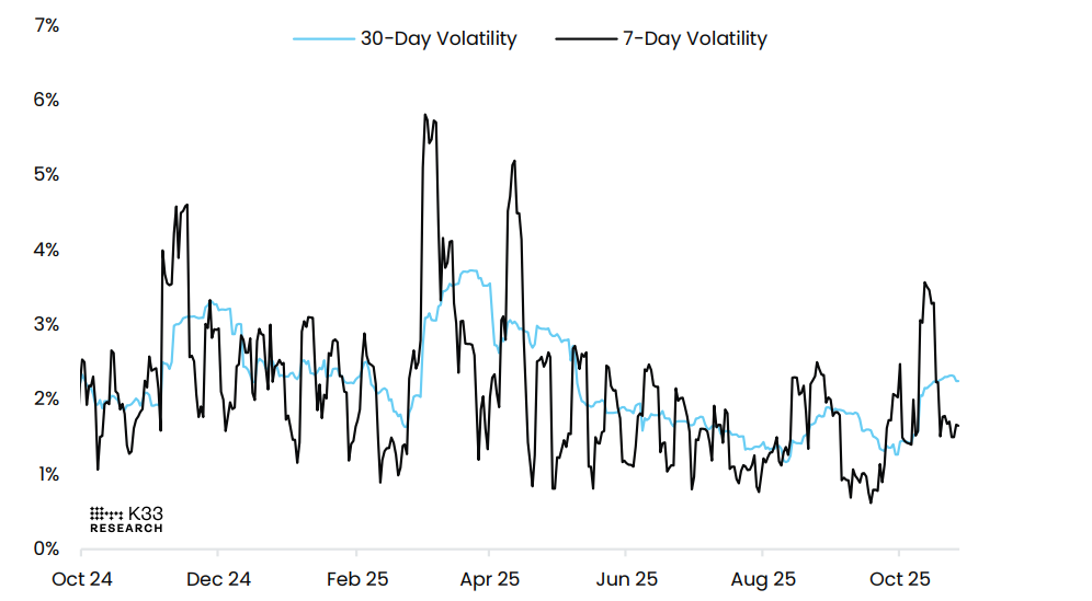 يكشف النظر إلى مخطط تقلبات البيتكوين الديناميات الحالية للسوق. بينما انخفض متوسط تقلب البيتكوين لمدة 7 أيام إلى 1.6% من 1.8%، تظل التقلبات اليومية كبيرة. في 21 أكتوبر/تشرين الأول، ارتفعت البيتكوين بنسبة 5% وارتدت بالكامل عن الحركة خلال نفس الفترة الزمنية البالغة 24 ساعة - وهو حدث نادر يشير إلى سيولة مقيدة وعادة ما يظهر بالقرب من الأسعار المتطرفة. من الجدير بالذكر أن مثل هذه الأنماط من المكاسب والارتدادات لم تُلاحظ منذ أزمة التعريفات الجمركية في أوائل أبريل/نيسان، أي منذ حوالي 193 يومًا. يجب على المتداولين توخي الحذر من التقلبات القادمة.