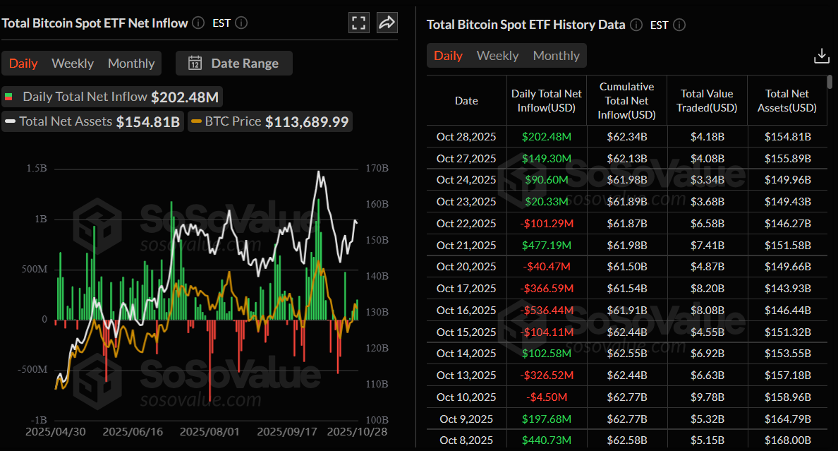 يظل سعر البيتكوين (BTC) ثابتًا بالقرب من 113,000 دولار في وقت كتابة هذا التقرير يوم الأربعاء، حيث يتبنى المتداولون موقفًا حذرًا قبل المحفزات الاقتصادية الرئيسية وصدور تقارير الأرباح. من المنتظر أن يعلن بنك الاحتياطي الفيدرالي (Fed) عن قراره بشأن سعر الفائدة، ومن المقرر أن تقدم شركات التكنولوجيا الكبرى - مايكروسوفت، ألفابيت، ميتا، آبل، أمازون - تقارير أرباح، مما قد يجلب تقلبات جديدة للأسواق التقليدية والرقمية. في الوقت نفسه، تستمر صناديق البيتكوين المتداولة الفورية المدرجة في الولايات المتحدة في إظهار طلب قوي، حيث شهدت تدفقات داخلية بقيمة 202.48 مليون دولار يوم الثلاثاء، ممددة سلسلة إيجابية استمرت لأربعة أيام.