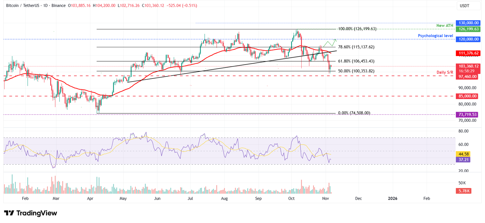 تعرض سعر البيتكوين للرفض قرب خط الاتجاه المكسور سابقًا يوم الاثنين وانخفض بنسبة 8.18% حتى اليوم التالي، مع إعادة اختبار مستوى تصحيح 50% عند 100353 دولار. ومع ذلك، في يوم الأربعاء، تعافى سعر البيتكوين بنسبة 2.35% بعد العثور على دعم قرب مستوى 100353 دولار. في وقت كتابة هذا التقرير يوم الخميس، يحوم سعر البيتكوين في محيط منطقة 103000 دولار.
