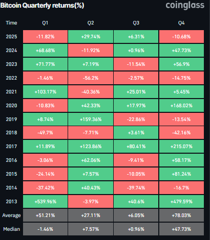 بالإضافة إلى هذا التفاؤل، كان الربع الرابع (Q4) هو أفضل ربع لبيتكوين بشكل عام، بمتوسط 78.03%، مما قد يدفع بيتكوين إلى قمم جديدة بحلول نهاية العام.