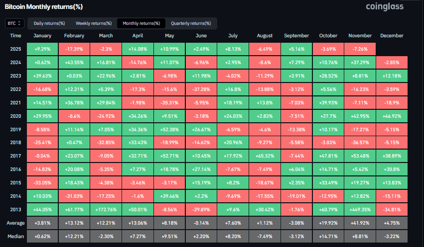تظهر البيانات التاريخية من كوين جلاس CoinGlass أنه على الرغم من تسجيل بيتكوين خسارة بنسبة 3.69% في أكتوبر/تشرين الأول - مما خيب آمال المتداولين الذين توقعوا حدوث ظاهرة "أبتوبر" - إلا أن نوفمبر/تشرين الثاني كان تاريخيًا هو الشهر الأقوى لبيتكوين، حيث حقق متوسط عائد قدره 41.92%.