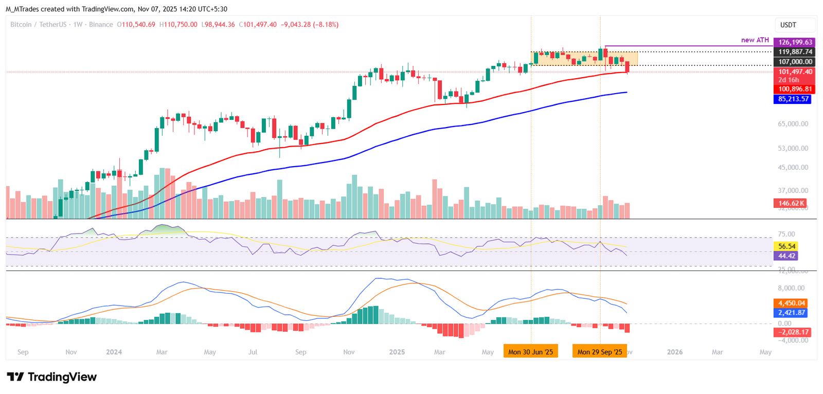 يوضح الرسم البياني الأسبوعي لبيتكوين تصحيحًا بأكثر من 20% من قمتها التاريخية البالغة 126,199 دولار خلال الأسابيع الخمسة الماضية، حيث وصل السعر إلى أدنى مستوى له عند 98,944 دولار هذا الأسبوع وأعاد اختبار المتوسط المتحرك الأسي لمدة 50 أسبوعًا (EMA) في محيط منطقة 100,896 دولار.