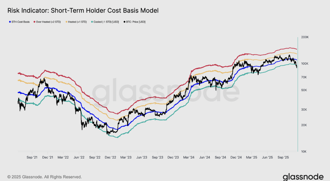 سلط تقرير جلاس نود Glassnode الأسبوعي يوم الأربعاء الضوء على تحول واضح في هيكل سوق البيتكوين، مع انهيار حاسم دون 97000 دولار. ثم انخفض سعر البيتكوين إلى 89000 دولار، مسجلاً أدنى مستوى محلي جديد دون نطاق الانحراف المعياري الواحد (95400 دولار) بالنسبة لأساس تكلفة حاملي المدى القصير (STH)، والذي أصبح الآن بالقرب من 109500 دولار كما هو موضح في الرسم البياني أدناه.