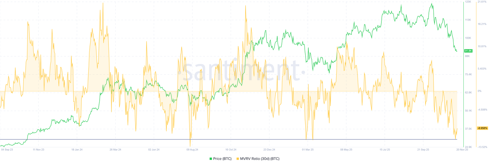 تشير هذه القراءة السلبية لنسبة القيمة السوقية إلى القيمة المحققة MVRV إلى أن البيتكوين مقومة حاليًا بأقل من قيمتها، حيث يجلس حاملوها على خسائر غير مدركة. وغالبًا ما تُعتبر مثل هذه الظروف إشارة شراء محتملة، مما يزيد من ضغط الشراء عبر البورصات. تاريخيًا، عندما انخفضت نسبة القيمة السوقية إلى القيمة المحققة MVRV لبيتكوين إلى مستويات مماثلة، كان السعر يميل إلى الارتداد في المدى القصير.