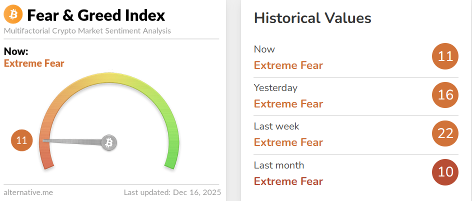 انخفض مؤشر الخوف والطمع إلى 11 يوم الثلاثاء، مقتربًا من أدنى مستوياته في نوفمبر، مما يشير إلى تحول حاد نحو الخوف الشديد حيث يستعد المشاركون في السوق لمزيد من الانخفاض.