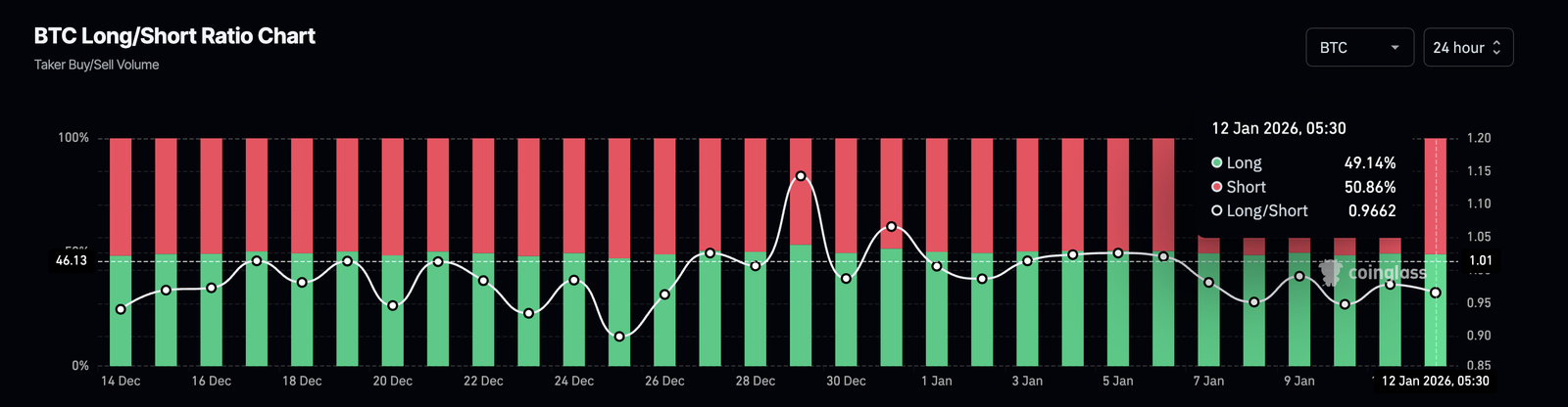 على جانب المشتقات، تُظهر بيانات نسبة المراكز الطويلة إلى القصيرة أن 50.86% من المراكز الهبوطية النشطة تم فتحها في الـ 24 ساعة الماضية، مما يحافظ على النسبة عند 0.9662.
