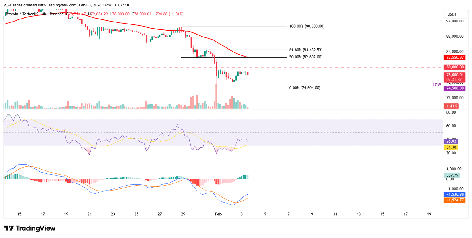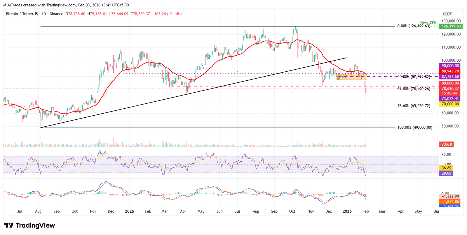 على الرسم البياني اليومي، أغلق البيتكوين دون مستوى تصحيح فيبوناتشي 61.8% (من أدنى مستوى في أغسطس/آب 2024 عند 49000 دولار إلى أعلى مستوى تاريخي في أكتوبر/تشرين الأول 2025 عند 126199 دولار) عند 78490 دولار يوم الأحد، ويواجه مقاومة قرب هذا المستوى يوم الثلاثاء.