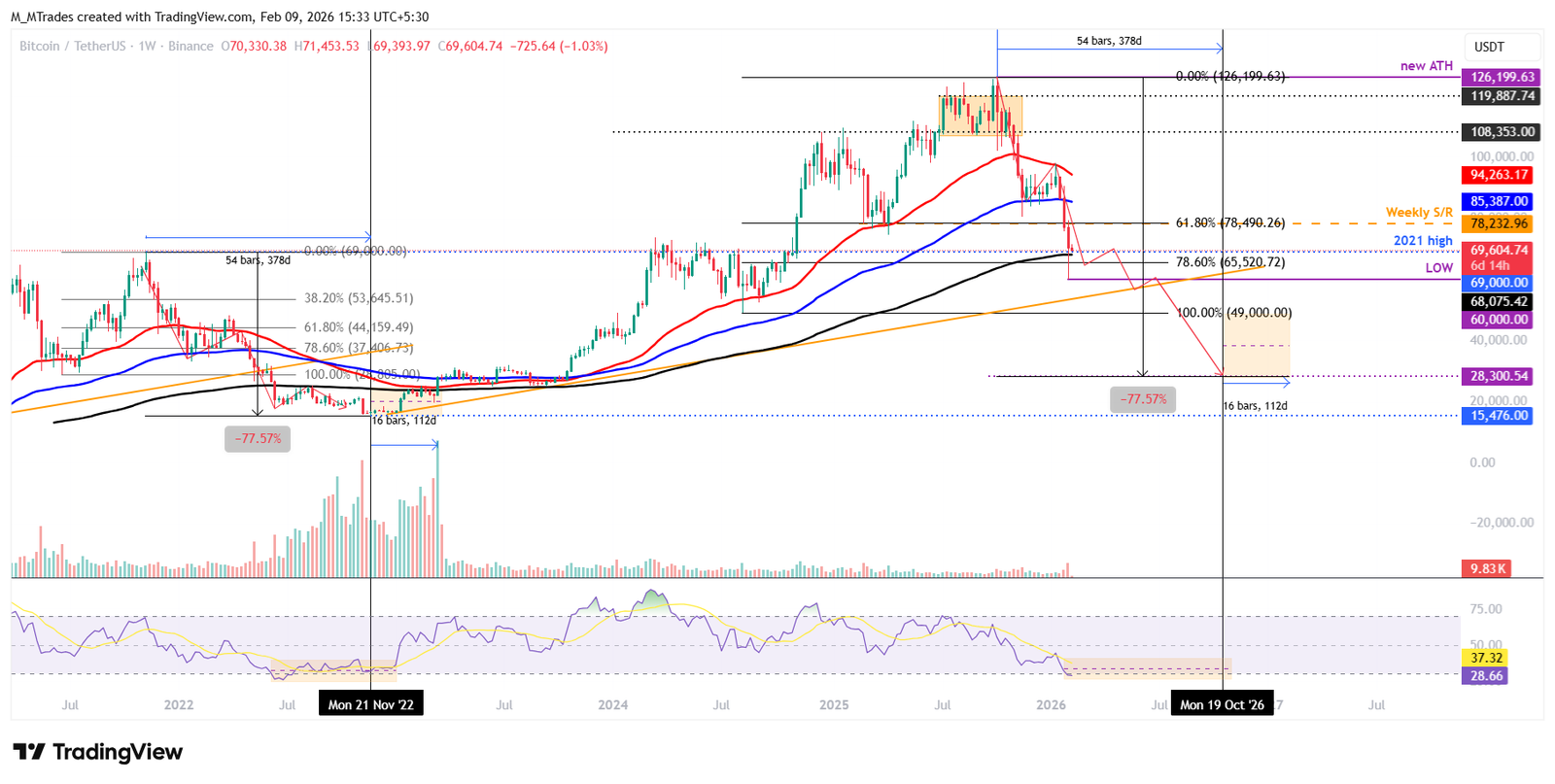 كما في فترة 2025-2026، وصلت البيتكوين إلى قمة تاريخية جديدة عند 126199 دولار في أكتوبر/تشرين الأول 2025 وصححت بنسبة 45% خلال الأسبوع الأول من فبراير/شباط، مع العثور على دعم قرب المتوسط المتحرك الأسي لمدة 200 أسبوع عند 68075 دولار.