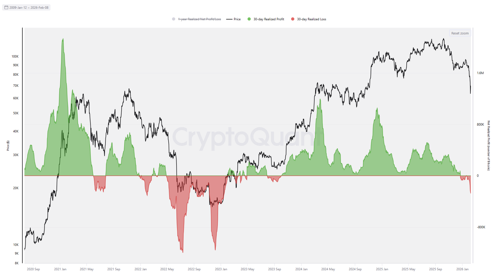 - تظهر بيانات السلسلة أن النظام الهبوطي بدأ على البيتكوين، حيث تجاوزت الخسارة المحققة لمدة 30 يومًا 263000 بيتكوين.
