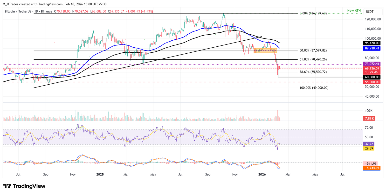 إذا استمرت البيتكوين في اتجاهها الهبوطي، فقد يمتد الانخفاض نحو مستوى تصحيح فيبوناتشي 78.6% (الممتد من قاع أغسطس/آب 2024 عند 49000 دولار إلى قمة تاريخية في أكتوبر/تشرين الأول 2025 عند 126199 دولار) عند 65520 دولار.